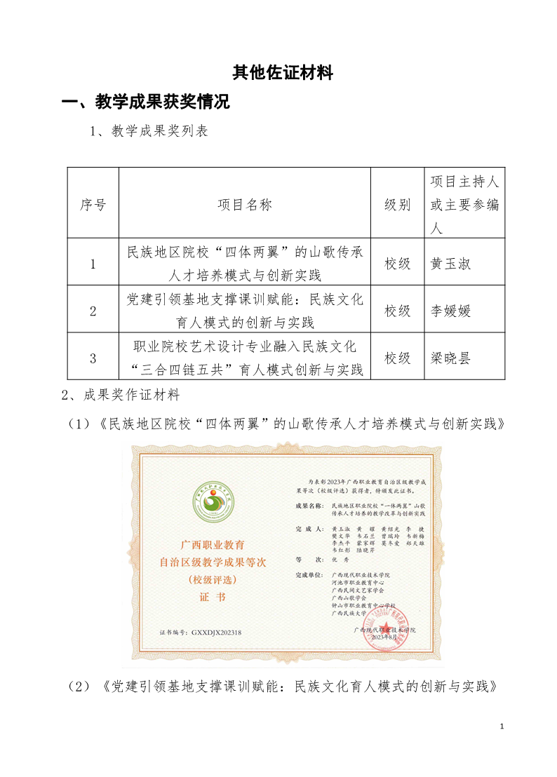 民族文化传承(壮族蚂拐歌)创新职业教育基地项目其他佐证材料 来源:教师教育学院 发布时间:2023-11-29 17:29:21 浏览次数: 次 【字体:小 大】 文件下载:民族文化传承(壮族蚂拐歌)创新职业教育基地项目其他佐证材料.pdf 终审:gxxdxcb003 【打印正文】 相关信息