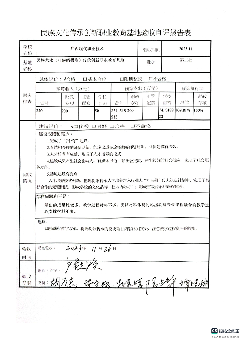 民族文化传承(壮族蚂拐歌)创新职业教育基地项目自评报告 来源:教师教育学院 发布时间:2023-11-29 17:38:27 浏览次数: 次 【字体:小 大】 文件下载:民族文化传承(壮族蚂拐歌)创新职业教育基地项目自评报告.pdf 终审:gxxdxcb003 【打印正文】 相关信息