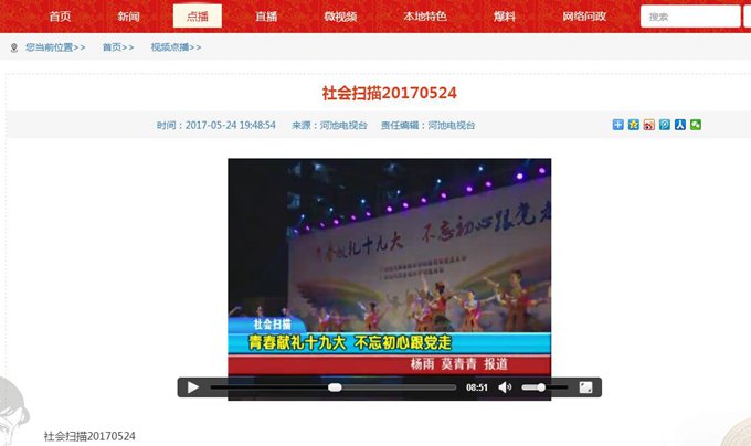 [社会扫描]青春献礼十九大 不忘初心跟党走 来源: 发布时间:2017-05-25 08:50:57 浏览次数: 次 【字体:小 大】 【注:请点击以下“河池视频网”网址进入观看,我院“青春献礼十九大 不忘初心跟党走”新闻从8分37秒开始】 河池视频网网址:http://www.hcbtv.com/getNewsInfo.action?flag=video&newsId=1193 新闻截图: 【打印正文】 相关信息