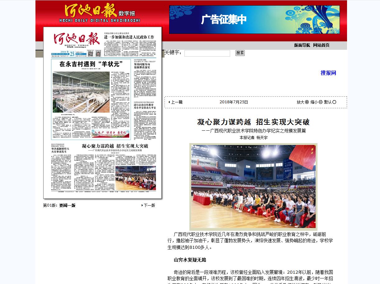 [河池日报]凝心聚力谋跨越 招生实现大突破——广西现代职业技术学院特色办学纪实之规模发展篇 来源: 发布时间:2018-07-26 15:04:36 浏览次数: 次 【字体:小 大】 新闻截图: 【打印正文】 相关信息