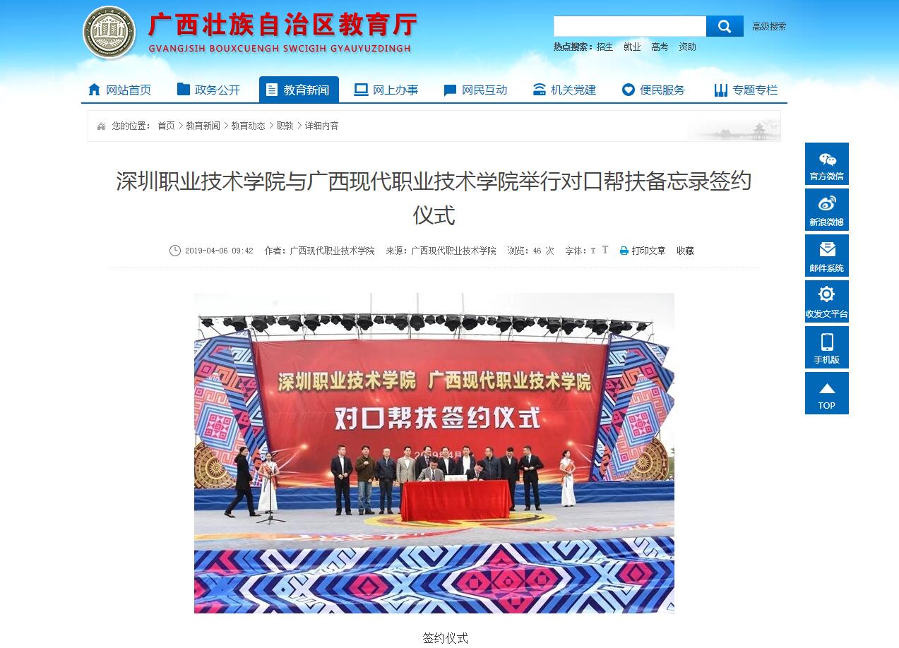 [自治区教育厅官网]深圳职业技术学院与广西现代职业技术学院举行对口帮扶备忘录签约仪式 来源: 发布时间:2019-04-26 19:34:36 浏览次数: 次 【字体:小 大】 【注:请点击以下网址进入观看】 点击网址:http://www.gxedu.gov.cn/Item/21088.aspx 新闻截图: 【打印正文】 相关信息