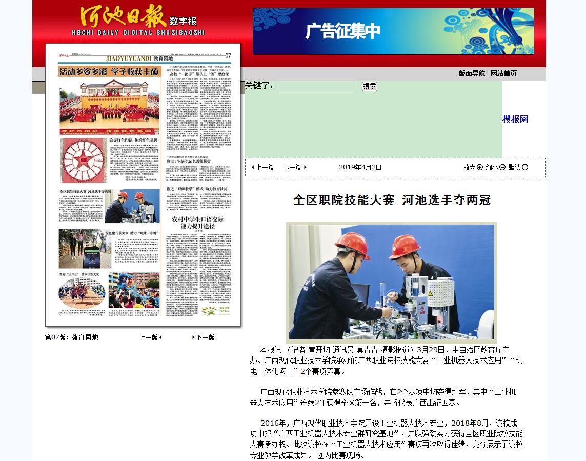 [河池日报]全区职院技能大赛 河池选手夺两冠 来源: 发布时间:2019-04-03 09:41:12 浏览次数: 次 【字体:小 大】 作者: | 日期:2019-4-3 9:41:12 | 浏览数:85 | 今日浏览数:1 新闻截图: 【打印正文】 相关信息