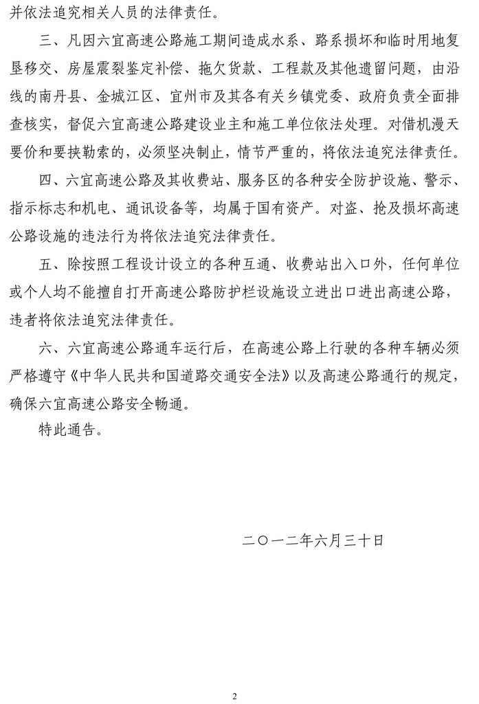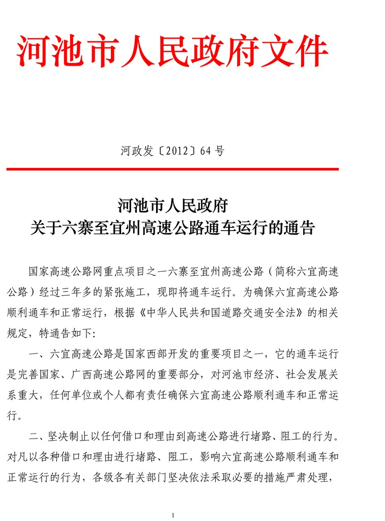 河池市人民政府关于六寨至宜州高速公路通车运行的通告