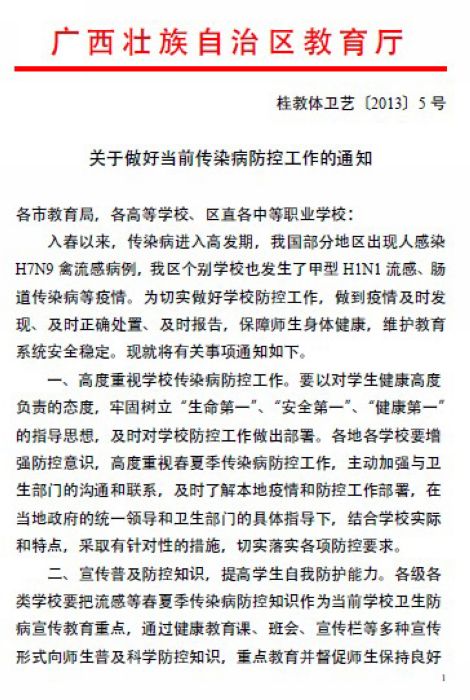 关于做好当前传染病防控工作的通知[桂教体卫艺〔2013〕5号]