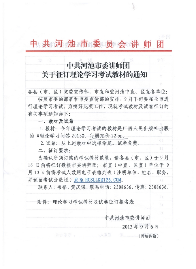 通知 来源: 发布时间:2013-09-22 08:34:31 浏览次数: 次 【字体:小 大】 通 知 院属各部门: 按照市委的部署和市委宣传部的安排,9月下旬要在全市进行理论学习考试,现要征订教材,请各部门于9月23日下午下班前收齐本部门的费用后交至院办潘杨处,由院办统一上交到市委讲师团。(注:参加考试人员为在编的教职员工) 广西现代职业技术学院 2013年9月23日 【打印正文】 相关信息