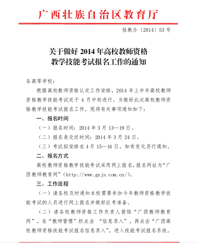 转发自治区教育厅关于做好2014年高校教师资格教学技能考试报名工作的通知