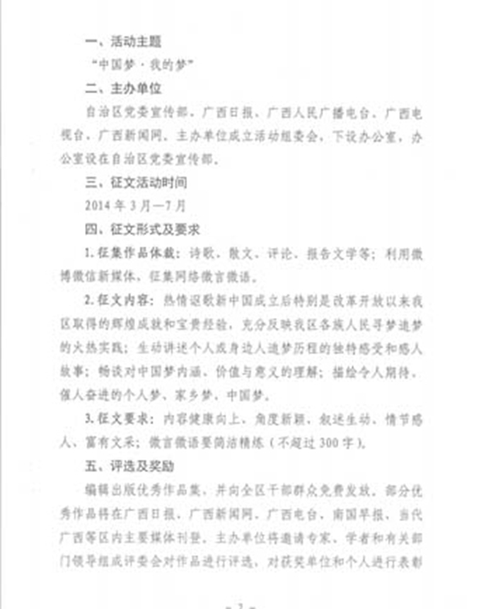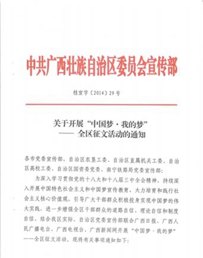 现将自治区党委宣传部《关于开展“中国梦·我的梦”——全区征文活动的通知》(桂宣字﹝2014﹞29号)转发给你们,请按照要求组织本总支广大师生积极参加,并于2014年6月15日前将推荐上送的参加作品电子版统一发至学院党委宣传部邮箱:gxxdzyxcb@163.com。