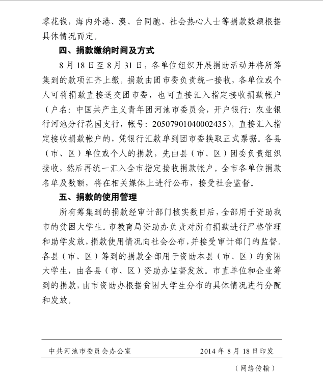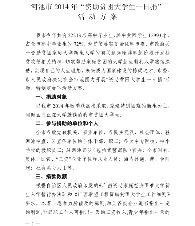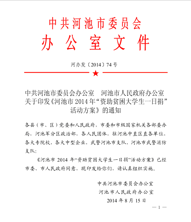 关于组织全院教职工进行“一日捐”的通知 来源: 发布时间:2014-08-26 09:13:48 浏览次数: 次 【字体:小 大】 关于组织全院教职工进行“一日捐”的通知 院属各部门、各单位: 请各部门(单位)组织本部门教职工进行捐款,并将款项于2014年8月29日上午下班前交至院办201办公室。(附:请以部门为单位统一制作捐款明细) 附件:河办发〔2014〕74号 广西现代职业技术学院院长办公室 2014年8月26日 【打印正文】 相关信息