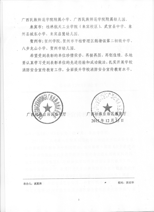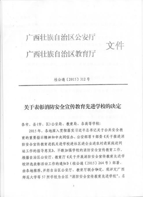 自治区公安厅、教育厅关于表彰消防安全宣传教育先进学校的决定 来源: 发布时间:2015-12-24 16:20:05 浏览次数: 次 【字体:小 大】 关于表彰消防安全宣传教育先进学校的决定 【打印正文】 相关信息