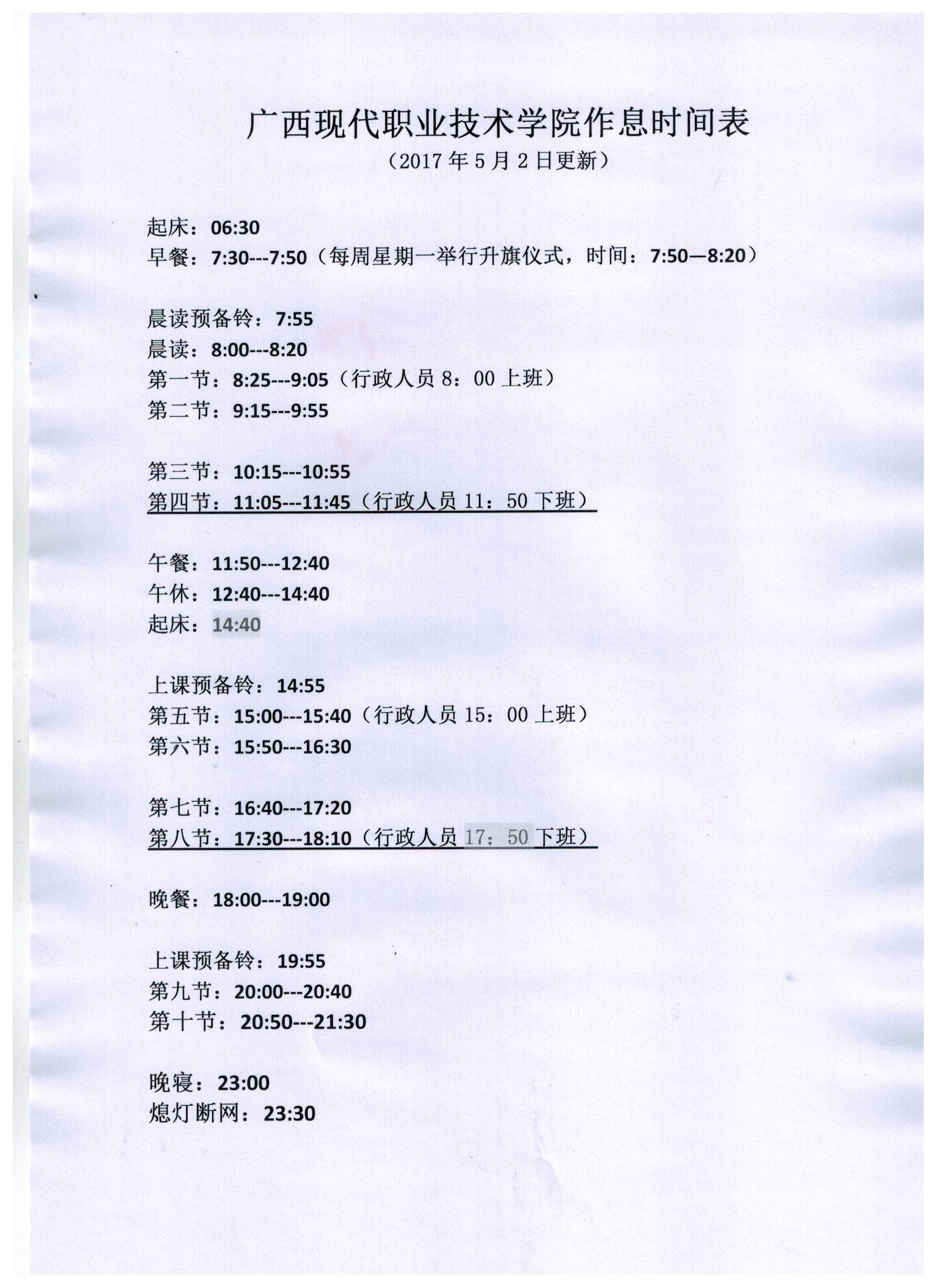 关于实行夏季作息时间的通知 来源: 发布时间:2017-05-01 15:38:06 浏览次数: 次 【字体:小 大】 关于实行夏季作息时间的通知 院属各部门、各系: 结合我院实际,现将2017年夏季作息时间安排如下,从2017年5月1日晚自习开始执行。 特此通知。 附:广西现代职业技术学院夏季作息时间表 广西现代职业技术学院院长办公室 2017年5月1日 【打印正文】 相关信息