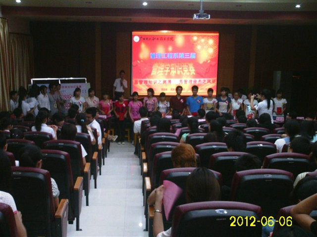 本站管理工程系学生会宣传部讯(李伯林) 为了丰富我系广大青年学生的校园生活,深化同学们对管理学知识的认识,加强校园学习氛围,促进学风建设和精神文明建设,我系于2012年6月6日晚7:30在学院第一学术报告厅举办了第三届管理学知识竞赛活动。出席此次活动的有:系领导韦永福主任、各专业课教师代表、赞助商代表、各班辅导员以及各系学生会代表和我系大一的全体同学。