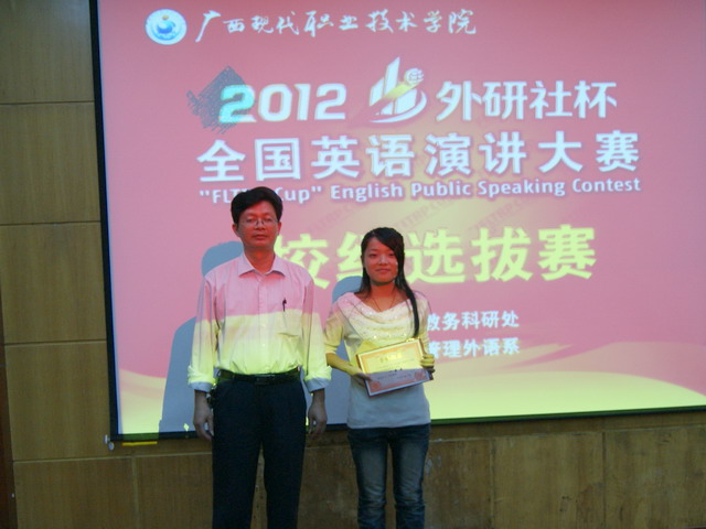 管理工程系、外国语系讯(匡华 覃素香)由我院教务科研处和管理外语系共同举办的2012年“外研社杯”全国英语演讲比赛暨广西现代职业技术学院选拔赛于2012年10月30日晚圆满落下帷幕,来自我院各系的18名选手参加了主题为“What We Can Not Afford to Lose”的演讲比赛。