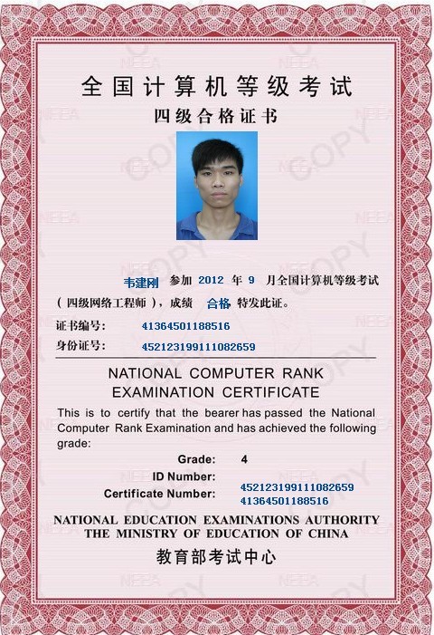 [计算机工程系计算机教研室讯]我院计算机工程系10级计算机网络技术专业韦建刚同学顺利通过了2012年9月全国计算机等级考试,并取得了四级网络工程师,实现了我院在校生IT工程师考试通过率零的突破,本次考试,河池考区共有三人通过该类别考试。