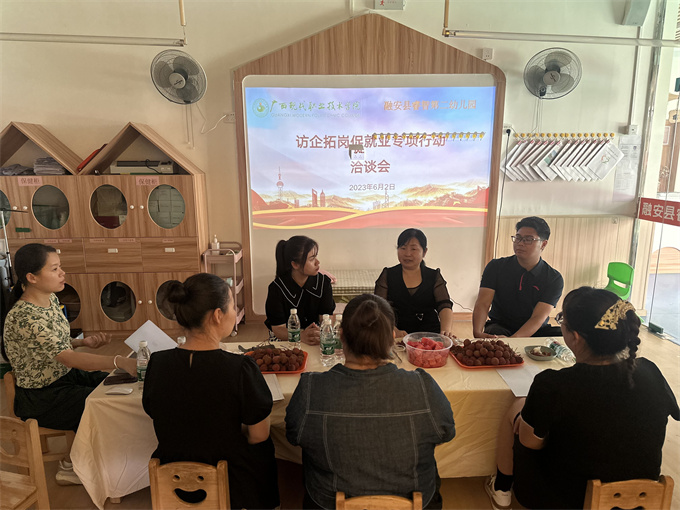 本次活动共走访了柳州融安县东方上城幼儿园、柳州融安县睿智第二幼儿园、柳州融安县青葵幼儿园、柳州市行知柳南电力幼儿园共计4家单位。首先各单位向广西现代职业技术学院一行的到来表示热烈欢迎,在随后的交谈中充分肯定了本校当前的培养模式以及毕业生的专业技能和职业素养。同时单位的人事招聘负责领导也分别对单位规模、文化、用人需求、招聘标准等情况进行详细介绍,并表达了对与我校建立长期合作共建关系的期待。