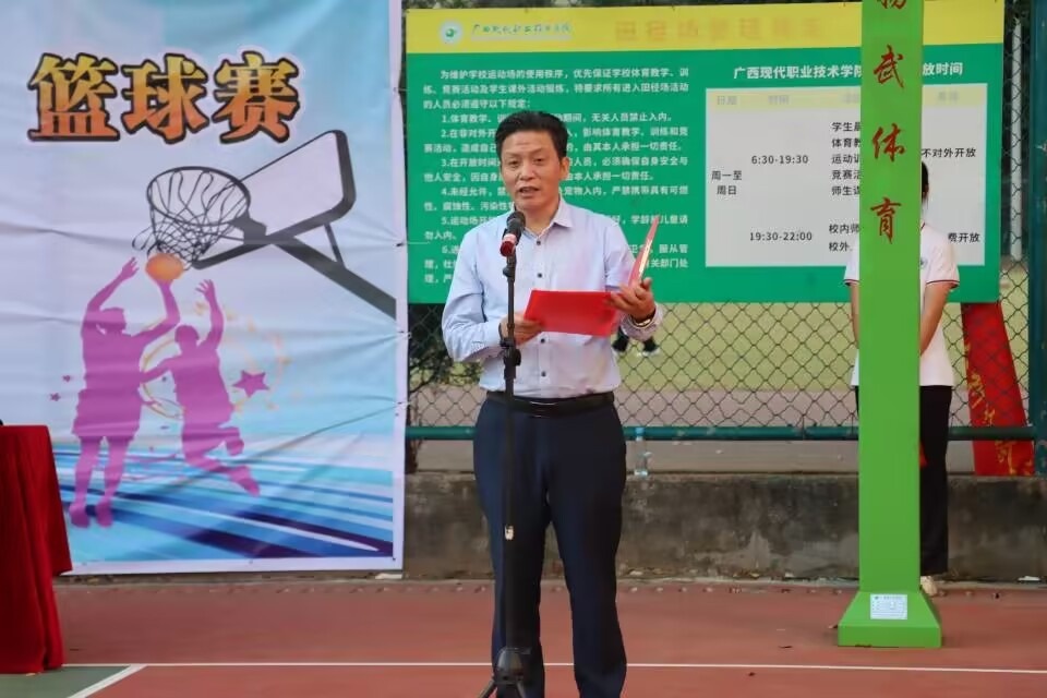 10月31日下午,智能冶金学院2023年第三届“银亿杯”篮球赛开幕式在篮球场上举行,广西银亿新材料有限公司副总经理、工会主席章群宏、人力资源部经理刘美强、品管部化验室主任李品碧受邀参与篮球赛开幕式,学校校长助理、智能冶金学院党支部书记骆伦彪、院长雷玉办、党支部副书记韦利余、副院长蓝光泽、副院长王岩出席篮球赛开幕式,智能冶金学院全体教师、班主任、辅导员和全体同学参加本次开幕式。23化工1班辛芳雨同学主持开幕式。