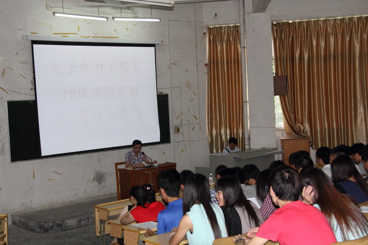 电子电力工程系讯 2013年6月27日15时,我系于学院第一阶梯教室召开10级顶岗实习总结大会,出席本次会议的有中科雅图信息技术有限公司黄总经理、何经理、系党总支书记韩锐老师、系主任兰建扬老师、副主任颜增显老师、各毕业班辅导员、班主任、系10级全体同学以及11、12级部分学生代表。