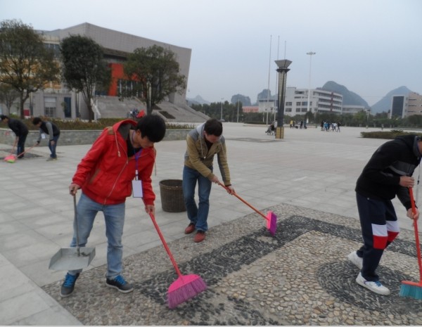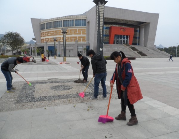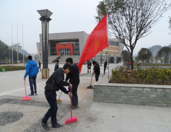 我系在辅导员罗皓老师的带领下将雷锋精神延伸到了校外,以“践行核心价值观,志愿服务我先行”为主题的志愿服务,学生会全体成员自带劳动工具精神抖擞地前往体育馆开展志愿打扫活动。