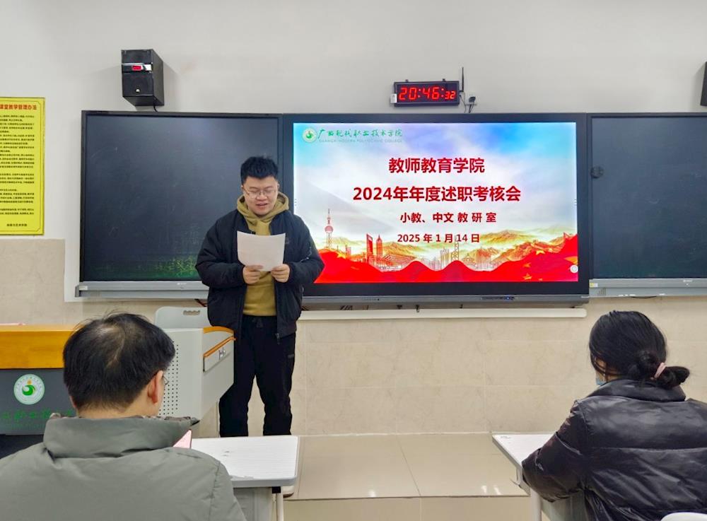 会议分为三个阶段进行。第一阶段,以教研室为单位开展述职考核,学院领导深入各教研室,听取专任教师汇报了2024年度在教学、科研、社会服务等方面的履职工作情况、存在的不足及原因、下一年的整改措施等。第二阶段,全体中层领导、行政人员及辅导员向全体教职工述职。第三阶段,全体教职工根据《中共广西现代职业技术学院委员会中层干部考核办法》及《广西现代职业技术学院职工考核评价实施办法》,对领导班子成员、行政人员及辅导员进行了现场不记名打分测评。