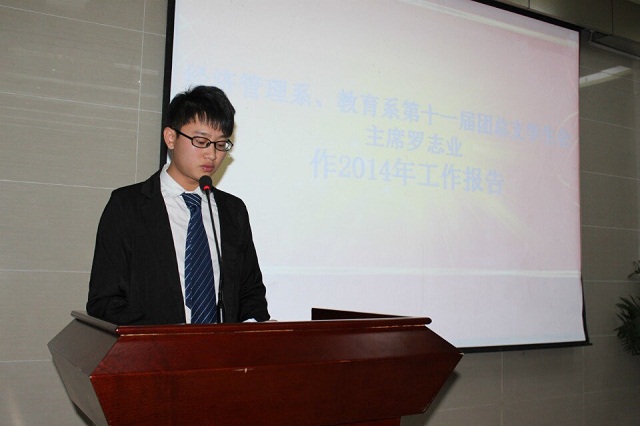 我系团总支学生会副书记莫昌秘作《团总支收支情况报告》,主席罗志业代表第十一届团总支学生会作了题为《与时俱进,开拓创新,为建设现代化和谐校园而奋斗努力》的工作报告。罗志业在报告中表示在过去的一年中我系学生会干部紧跟时代步伐,积极组织了“学雷锋、献爱心”、“欢乐蓝衣壮”专题讲座、“迎新杯”篮球赛、“新起航梦飞扬”迎新晚会等各种校园文体活动,为我系学生提供了施展才华的舞台、丰富了我系学生大学生活。