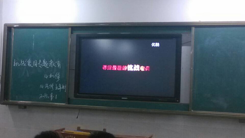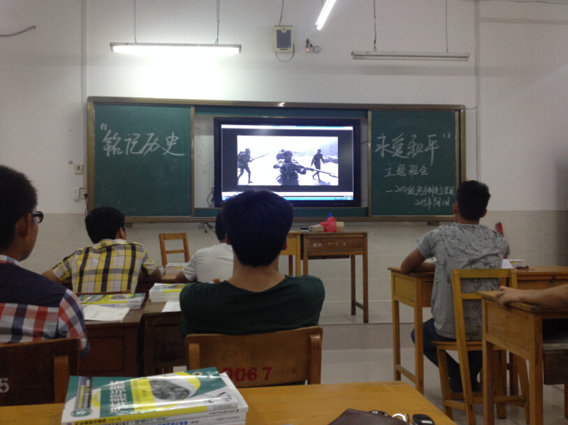 为纪念中国人民抗日战争胜利70周年暨世界反法西斯胜利70周年,回顾抗战历程,用回忆激发全系同学爱国、爱党的热情,2015年9月1日晚自习时间,机电工程系2014级各专业同学在教室观看关于抗日战争胜利七十周年的经典影片,列如:《狼牙山五壮士》、《地道战》、《地雷战》、《西安事变》等多部经典影片。