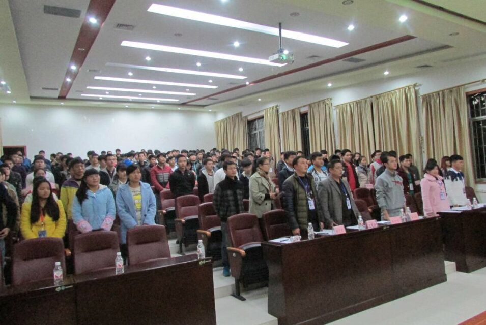 (电子系讯)2015年12月16日晚上19点30分,广西现代职业技术学院电子电力工程系团总支学生会在第一学术报告厅召开了学生干部表彰大会暨第第八届团总支学生会换届大会。出席此次会议的有电子电力工程系党总支书记兰建扬老师、党总支副书记侯干才老师、团总支书记黄红玉老师、辅导员覃文坛老师、各系学生会代表,以及第七届、第八届全体学生会成员等。