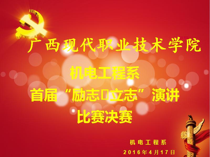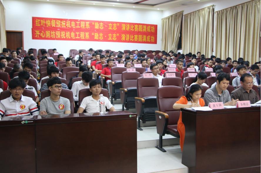 机电工程系团总支学生会 为大力宣传国家资助政策及成效,激励受助学生奋发自强、立志成才、感恩奉献,机电工程系于2016年4月17日19:30在学院第一学术报告厅举行“励志、立志”主题演讲比赛,参加本次活动的有:学院社科部主任韦朝忠、学院团委书记李媛媛、图书馆馆长黄秀德、黄立淑老师,以及本系团总支书记罗明都,各班级班主任和各系学生会代表。