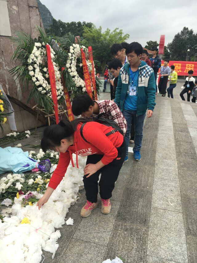 活动中,我系学习韦拔群先辈的革命精神,徒步前往河池市金城江烈士公园参加清明公祭革命烈士。同学们纷纷向广场上韦拔群烈士的塑像敬献了自己亲手折叠的小白花,深深鞠躬表达了对革命烈士的深切哀悼和无尽的崇敬之情。
