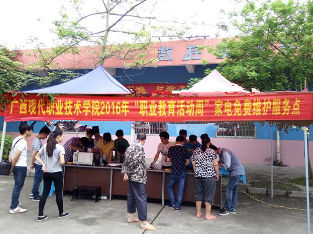 职业活动周同学们结合自身所学的专业技能,在余老师亲自做技术指导下。在校园开展的义务维修服务活动,为附近居民和校内老师修理一些各种各样损坏的小电器。在活动过程中,同学们发扬不怕苦、不怕累的精神这一天共计维修30余台家庭小电器,顺利的完成了本次义务维修活动。本次活动促进同学们之间的友谊,提高同学们的动手操作能力和社会实践能力。