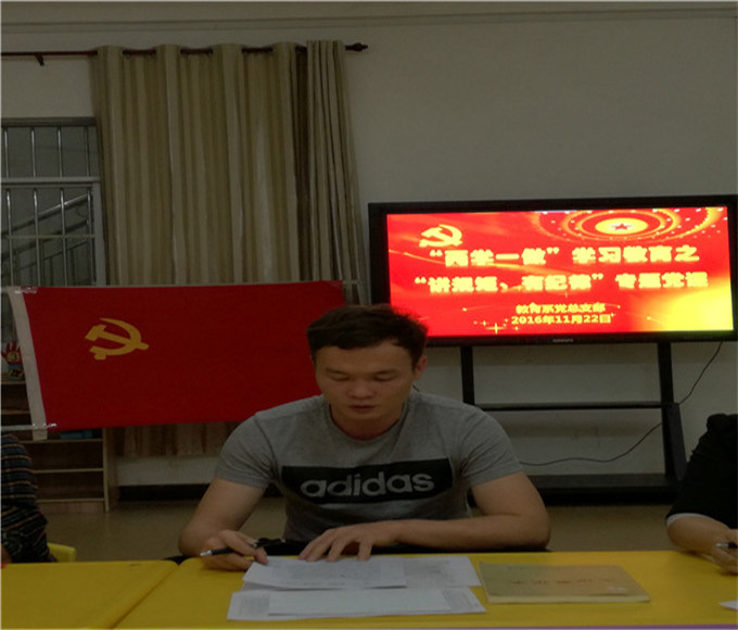 2016年11月22日晚上19:30,我系党总支组织全体党员开展“讲规矩、有纪律”专题党课教育,教育系党总支副书记罗皓以“做一个‘讲规矩、有纪律’的党员”为题上了一堂主题突出、内容详实、语言生动的专题党课,全体党员深受启迪。