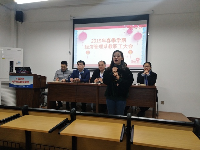 经济管理系召开2019年春季学期全体教职工大会 2019年3月4日早上8:30,经济管理系在电商大楼二楼会议室召开2019年春季学期经济管理系全体教职工大会,经管系主任杨奎,党总支书记卢绍迎,副主任潘杨,副主任叶秉高,副主任刘泽汀出席会议,全体教职工参加会议。会议由我系副主任叶秉高主持。 经管系主任杨奎在会上从五个方面解读我系新一学年来的工作。会上,杨主任对过去一年里我系取得的成绩以及存在的问题进行剖析,并指出我系在本学期将明确学院的决心,以专业建设为抓手,校企合作协同育人等为系部重点工作,提出我系要建设一支“用于担当、善于攻坚、乐于事业、奋斗出彩”的教师团队,为系部,为学院发展做贡献。 会上,我系党总支书记就学生管理工作进行部署,强调开学初各个班主任要加强对学生的安全工作进行排查,对卫生工作进行监督,加强对学生意识形态的教育,以及学生的规矩意识。最后卢书记提出所有学生的工作,作为教师应该将问题发现于一线,同时将其解决于一线。 系部各个分管领导对于各自分管的工作进行开学初部署。