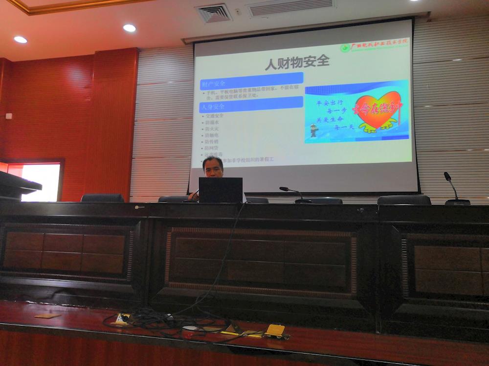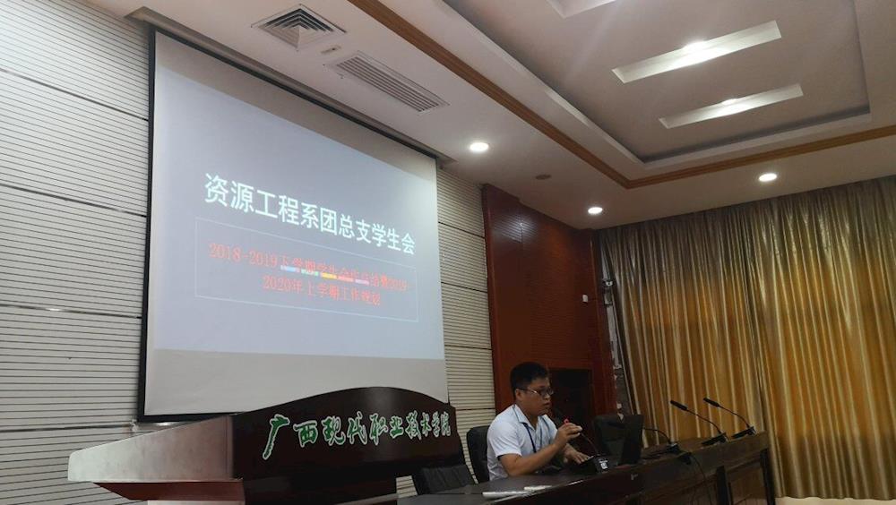 会议四个议程组成,办公室主任蓝光泽老师做学生资助体系详细介绍,团总支书记雷玉办老师做学生工作总结及规划,韦文业书记做全系工作总结,假期安全事项及假期竞赛培训的部署,最后公布本学期资源工程系优秀学生干部。最终韦文业书记为获奖学生颁奖,并号召所有学生向优秀学生学习。