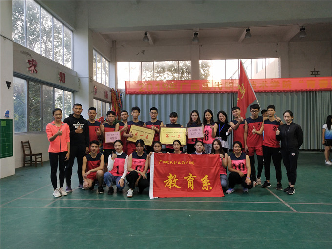赛场上,我系代表队本着“友谊第一,比赛第二”的原则,互相尊重、互相学习。赛场上,覃琳琳书记、容婕老师带领拉拉队员为运动员呐喊助威,比赛激烈异常,每位队员都拼尽全力发挥自己的最好水平,坚持个人技术与团队合作相结合。半决赛中,我系代表队战胜信电系男队,进入总决赛;总决赛对战建筑系,最终以21:14的比分喜获总决赛冠军。