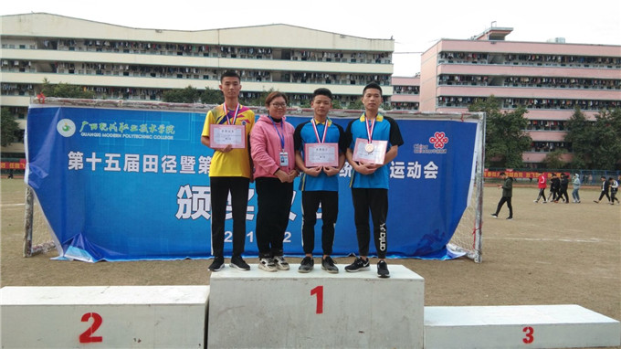 男子4×100米接力: 18小教3班黄智、19小教4班刘文龙、18小教2班莫常顺、19学前1班谢秀峰荣获第一名;