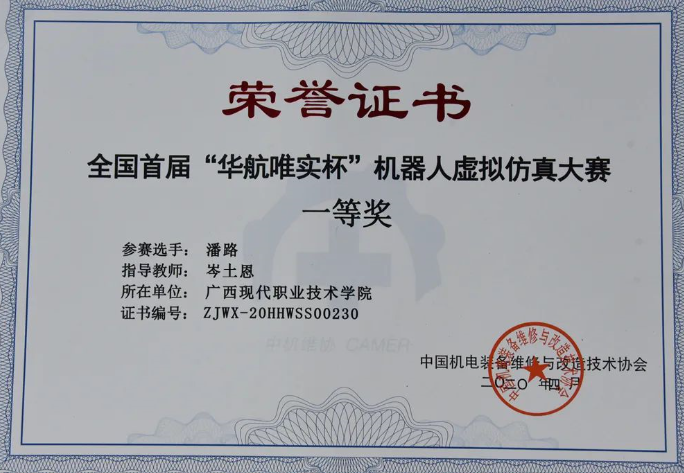 4月10,全国首届“华航唯实杯”机器人虚拟仿真大赛在线上举行,共有来自全国188所高校627名选手参赛,经过1小时的角逐,机电工程系18机器人衔接2班潘路同学脱颖而出,斩获高职组一等奖,岑土恩老师获得优秀指导教师荣誉称号。