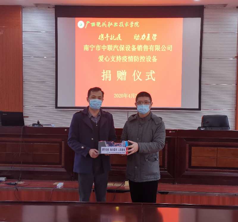 南宁中联汽保公司是广西领先的汽保设备及汽车教学设备的配套服务商。近年来,南宁中联汽保公司与我院在实训基地文化建设等方面合作成果丰硕。得知我校正为新学期复课开学工作努力准备,南宁中联汽保公司急我院之所急,主动向我院捐赠疫情防控物资,既体现了企业的社会责任和担当,也践行了校企合作相互支持的承诺。