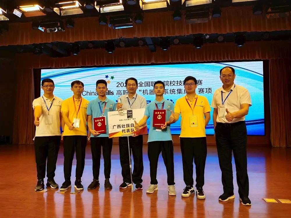 正逢庆祝建党一百周年之际,2021年5月21日晚,经过两天的激烈角逐,由教育部举办的2021年全国职业院校技能大赛“机器人系统集成”赛项,在山东济南圆满落下帷幕。我院代表广西出战国赛,在机电工程系岑华主任和指导教师涂翔宇、岑土恩的带领下,参赛选手18机器人衔接2班潘路和廖远杨同学不畏强手,努力拼搏,与来自全国27个省、自治区、直辖市的冠军代表队,共54名选手们同台竞技,最终以总分排名第二的好成绩斩获该赛项全国一等奖。这是我院夺得2019年全国职业院校技能大赛“工业机器人技术应用”和“制造单元智能化改造与集成技术”赛项双料冠军后的再一次夺魁!