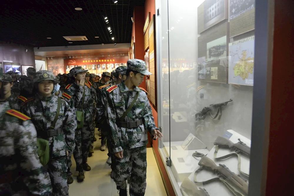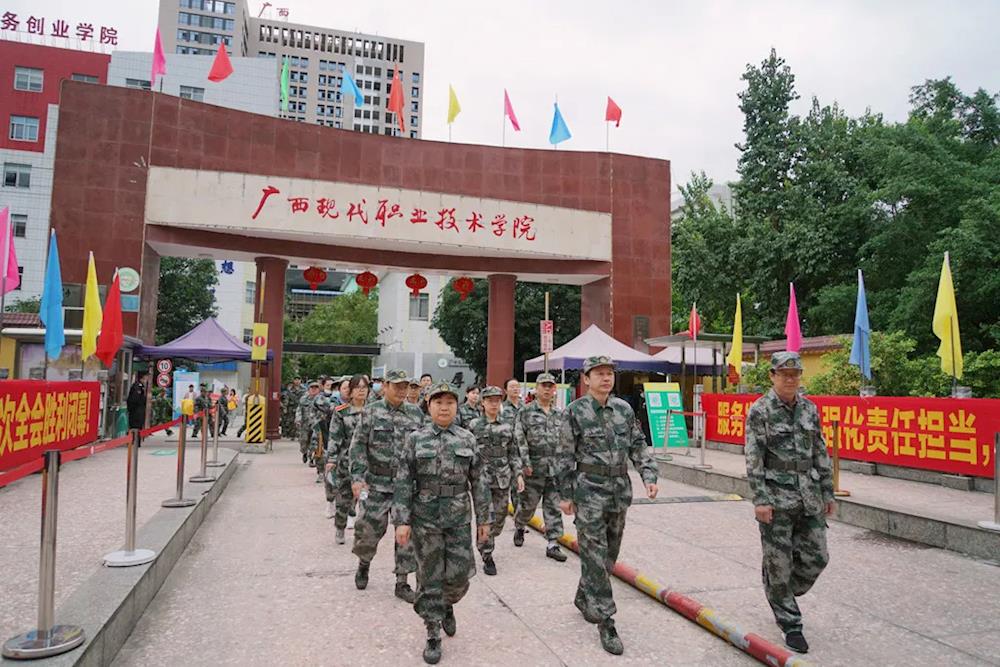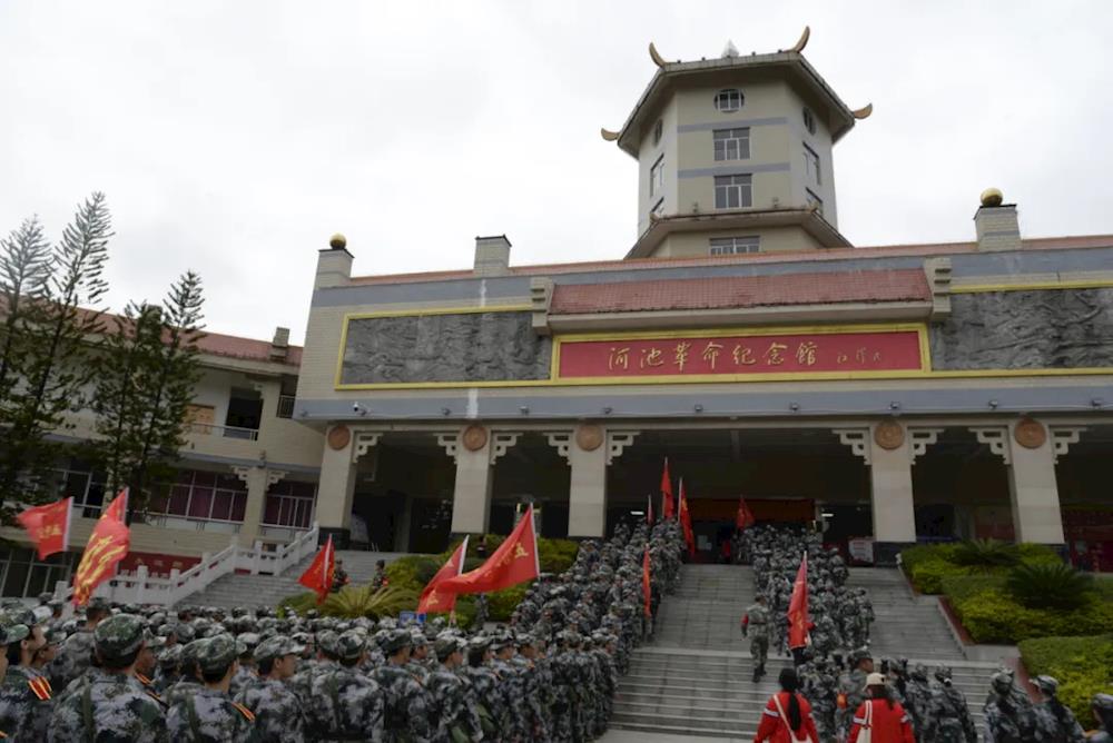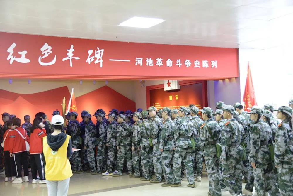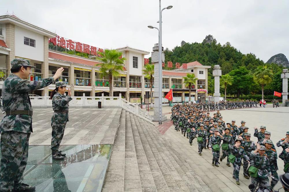 上午7时,师生们手举五星红旗,步伐整齐、精神抖擞地从学院出发。一路上,师生们高举旗帜,高喊嘹亮的口号,迈着矫健的步伐。在途经新建西路、城西大道等路段后,师生们到达休整地民族公园。在民族公园,师生们共同参观了河池革命纪念馆,了解河池的革命斗争史,感受革命精神。各党总支、党支部,以及各营(连)分别对师生进行爱国主义教育活动,培养学生的集体荣誉感,增强凝聚力。参观活动结束后,师生们有秩序地原路返校,此次军训徒步拉练活动圆满结束。