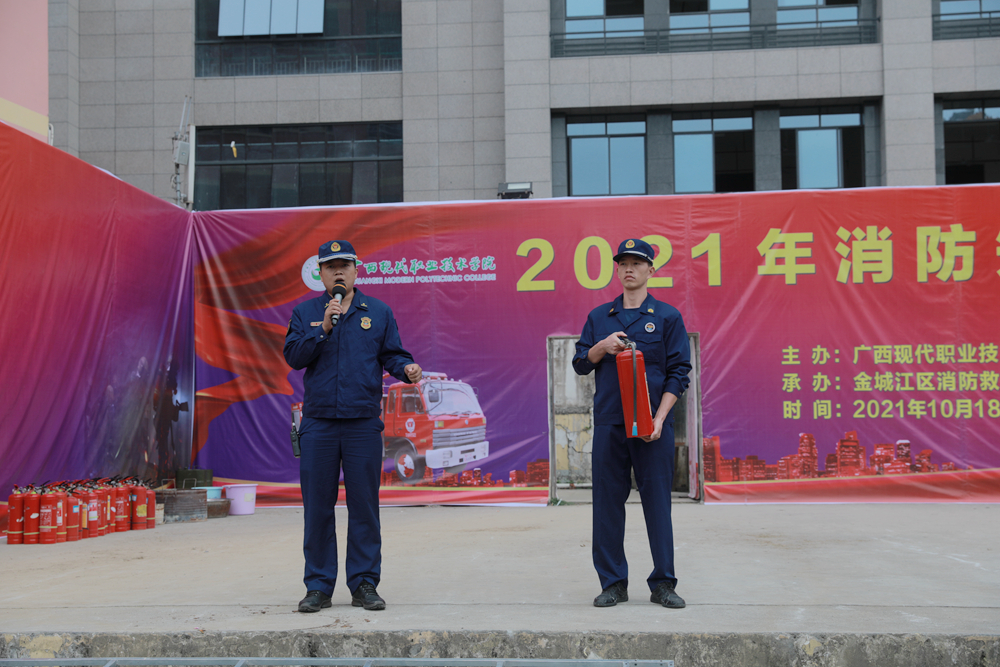 金城江区消防救援站站长左龙龙对此次演练进行点评。他向大家强调掌握应急避险知识的重要性,然后从消防安全常识、火场逃生、灭火器的使用等几个方面,对校园消防安全预防措施及火灾逃生技巧作了全面生动的讲解。在消防官兵的指导下,同学们实地参加灭火演习,并逐步掌握灭火器使用方法,亲身体验灭火过程。