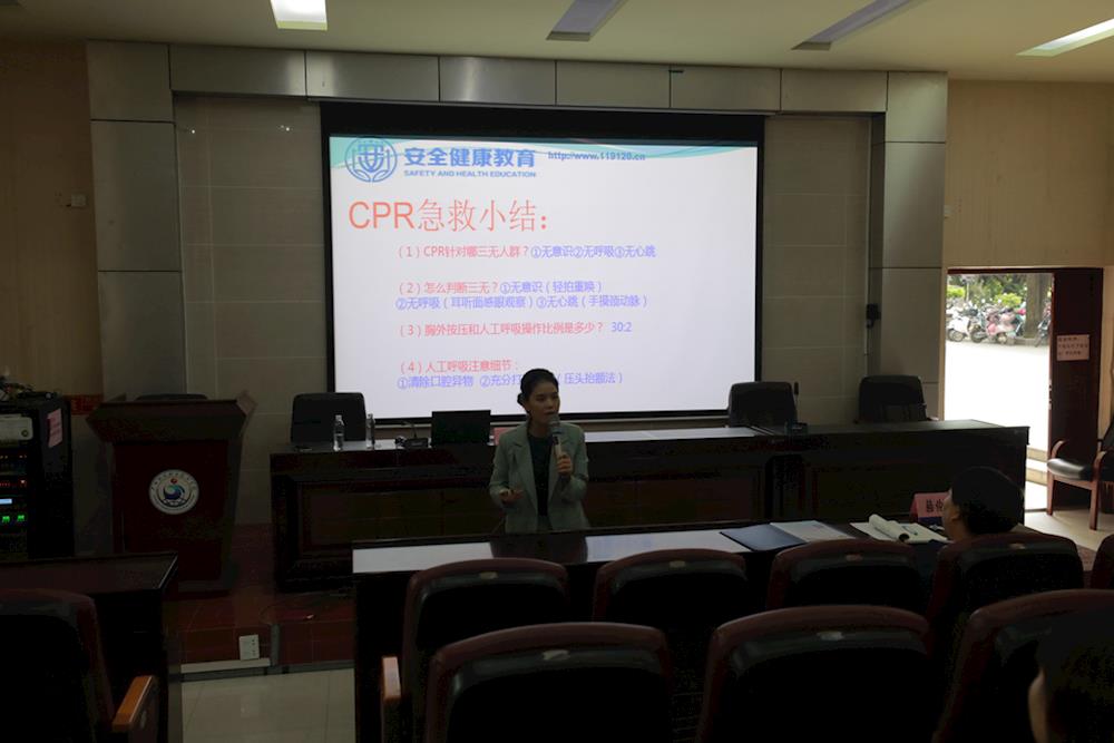 唐玲艳和黄娟连分别在两个会场以“师生健康中国健康”为主题,用生动的例子,诙谐的语言,从预防和应对校园突发安全事故急救常识,讲到预防心血管疾病等知识。讲解过程中,亲自示范,让大家掌握科学的救助常识,效果十分良好。