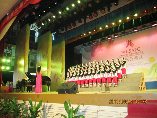 虽然我院是首次派队参加这一活动,但是参赛队员情绪高涨,精神饱满,信心十足。在舞蹈比赛中我院展演的《壮乡春雨》在悦耳的旋律中拉开序幕,壮乡少女曼妙的身影,婀娜的舞姿在春雨中散发着蓬蓬生机,青山、细雨、薄雾构成了一幅美丽的如梦如幻的壮锦,让观众获得了视觉和听觉享受。本次普通组的舞蹈项目有44个代表队参加,其中十一个为本科院校,我院获得三等奖,总排名13位,位居高职院校第二名。合唱比赛有33个代表队参加,我院选送的《苗歌唱来乐呵呵》和无伴奏合唱《天下有瑶就有爱》有着浓郁的民族特色,我院代表队第一个上台表演,歌声婉转起伏,优美动听,如甘露沁透心田,赢得评委和观众的好评,为比赛开了一个好头,在高职高专的排名中位列第九名。
