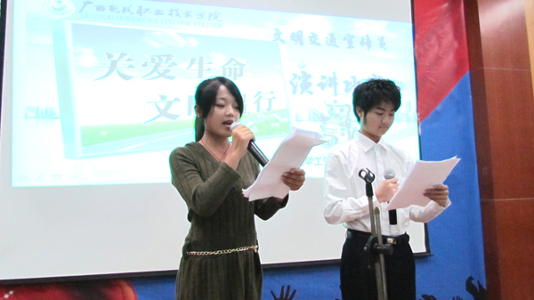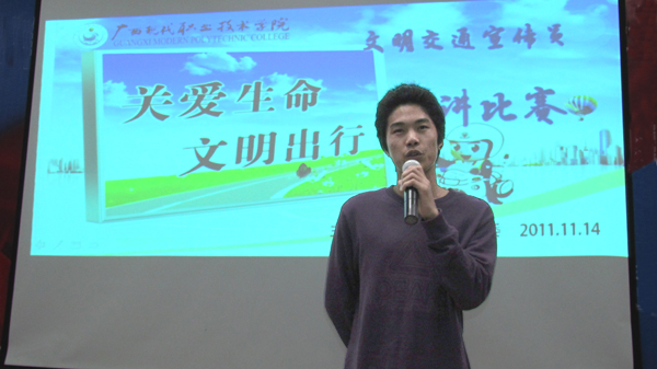 学院党委宣传部综讯(韦安然 曾严)于2011年11月14日晚,学院学工处、团委在学院第一学术报告厅举办“关爱生命 文明出行” 广西百万青年交通宣传员演讲比赛广西现代职业技术学院初赛。