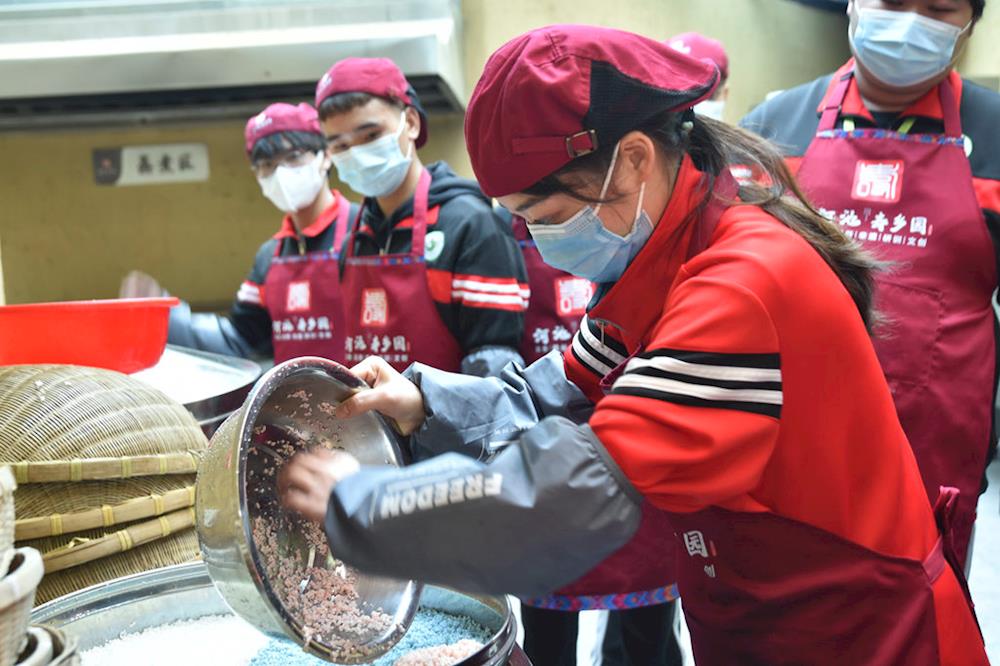 在美食制作现场,五位辅导员耐心为同学们讲解制作步骤,在校长以及各位老师的指导下,同学们分组学习并亲自动手包粽子、磨豆浆,做糯米糍粑、豆腐圆以及五色糯米饭等传统美食。大家齐心协力,踊跃参与其中,现场热火朝天。活动结束后,学生们纷纷表示今天不仅品尝了美食,还感受了传统美食文化的魅力,体验到了动手实践的快乐。