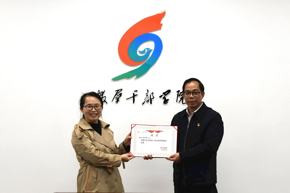 随后,黄绍光一行与拔群干部学院常务副院长覃英学,副院长蓝英参及相关部门负责人进行座谈交流。双方就师资共享、科研合作、党务活动、基地共享等方面深入交流与探讨,达成彼此共享共识,并举行两校干部教育培训战略合作签约仪式。会上,拔群干部学聘请我院校长黄绍光教授、马克思主义学院书记陆孟兰、副院长陆柳梅、教研室主任尹建强为拔群干部学院特聘教授。