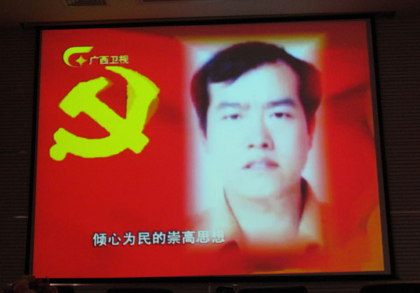 院党委宣传部讯(莫春燕) 为大力宣传表彰我区在创先争优活动中涌现的先进人物,发挥先进典型的引领示范作用,进一步深化创先争优活动,卫生部、自治区党委于2011年11月23日上午9:00在自治区党委礼堂召开追授蓝云同志荣誉称号命名表彰大会暨蓝云同志先进事迹主题情景报告会,并通过广西卫视和广西新闻网现场直播会议实况,我院党委书记邓福田及教职员工在学院第二学术报告厅全程集中收看。