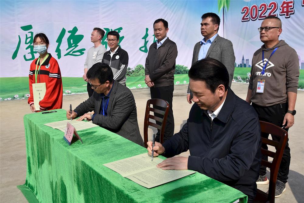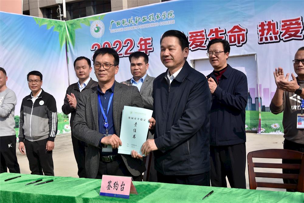 仪式上,卢森焕解读了2022年“珍爱生命 热爱生活”主题安全教育系列活动方案,二级学院领导代表、辅导员(班主任)代表、学生代表分别作表态发言,全体师生在启动仪式上集体宣誓,黄绍光还与行政部门和二级学院领导代表签订责任状。