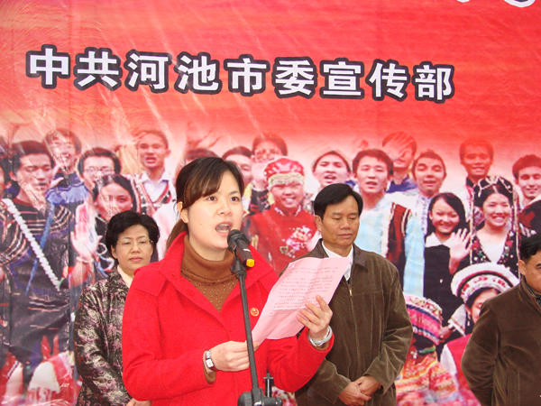 学院党委宣传部综讯(曾严 李媛媛) 2012年2月15日上午,河池市启动“弘扬广西精神,发扬老区传统”主题宣传教育活动,我院师生代表500多人和市直及驻河池中直区直各单位干部代表一起参加了启动仪式。河池市委常委、宣传部部长、副市长黎丽出席启动仪式并作动员讲话。