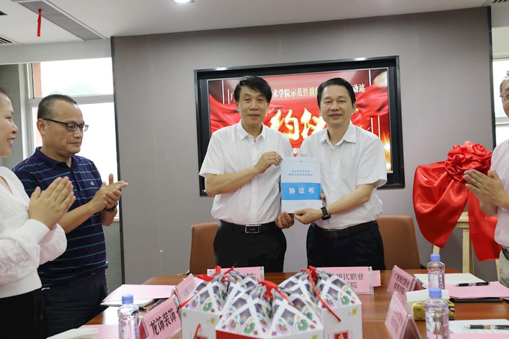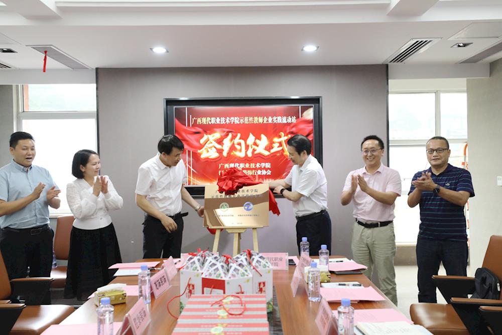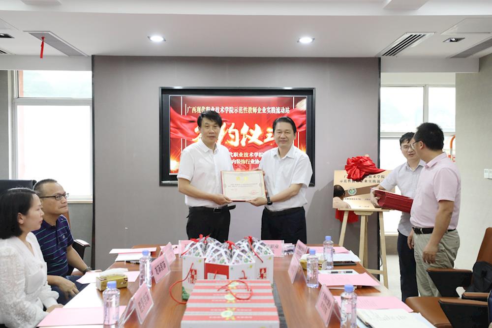 校企双方达成合作共识,黄绍光和苏晓丹共同签订示范性教师企业实践流动站协议,并为教师流动站揭牌。苏晓丹为教师代表颁发兼职教师聘书,黄绍光为企业代表颁发外聘教师聘书,全体与会同志合影留念。