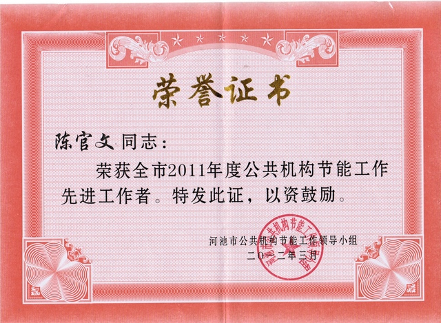 又讯(莫春燕、韦利宏):日前,河池市公共机构节能工作领导小组发布《关于表彰2011年度公共机构节能工作先进单位、先进个人的决定》(河政公共节能办发[2011]1号),表彰2011年河池市公共机构节能工作先进单位、先进个人,其中我院荣获先进单位,后勤管理处陈官文获先进个人称号。