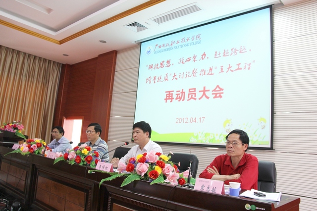 院党委宣传部讯(曾严 莫春燕) 2012年4月17日下午,我院召开“解放思想、凝心聚力、增量提质、赶超跨越”大讨论暨推进“五大工程”再动员大会。学院党委书记韦伟松,党委副书记、纪委书记覃志航,副院长冯忠伟及全体教职员工参加了会议。会议由覃志航副书记主持。
