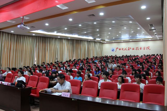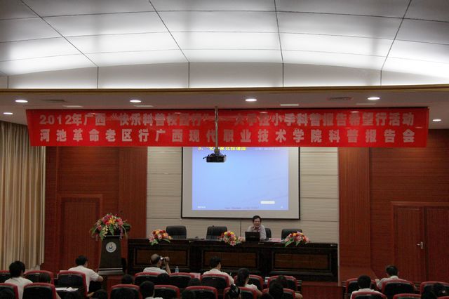 学院党委宣传部讯(曾严) 为深入贯彻党的十七届六中全会和自治区第十次党代会精神,进一步落实《全民科学素质行动计划纲要》,2012年5月23日下午, 2012年广西“快乐科普校园行”河池革命老区科普报告会在我院第二学术报告厅举行。报告会由中科院化学研究所研究员、博士生导师郭传杰教授主讲。广西科普演讲团团长、硕士研究生导师、原广西科协副主席蒋应时教授,学院党委副书记、纪委书记覃志航副教授,河池市科协调研员邱建强,河池市科协副主席韦炳富出席报告会。报告会由学院教务科研处处长韦胜东副教授主持。我院辅导员、学生代表300人参加了报告会。